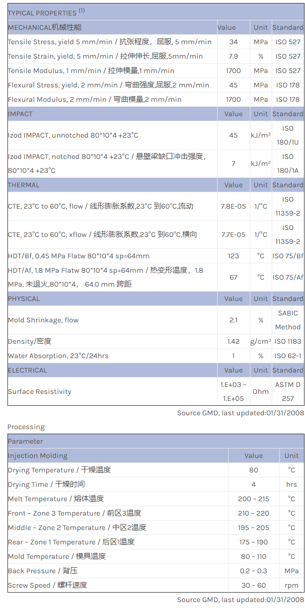 应用范围: 产品描述 LNP STATKON KD000EI物性表 LNP STAT-KON KD000EI是一种聚甲醛(POM)共聚物材料,含有的填充物为炭粉,加工方式为:注射成型。 LNP STAT-KON KD000EI的主要特性有: 阻燃/额定火焰 通过ROHS认证 相关色号:KD000EI-BKNAT