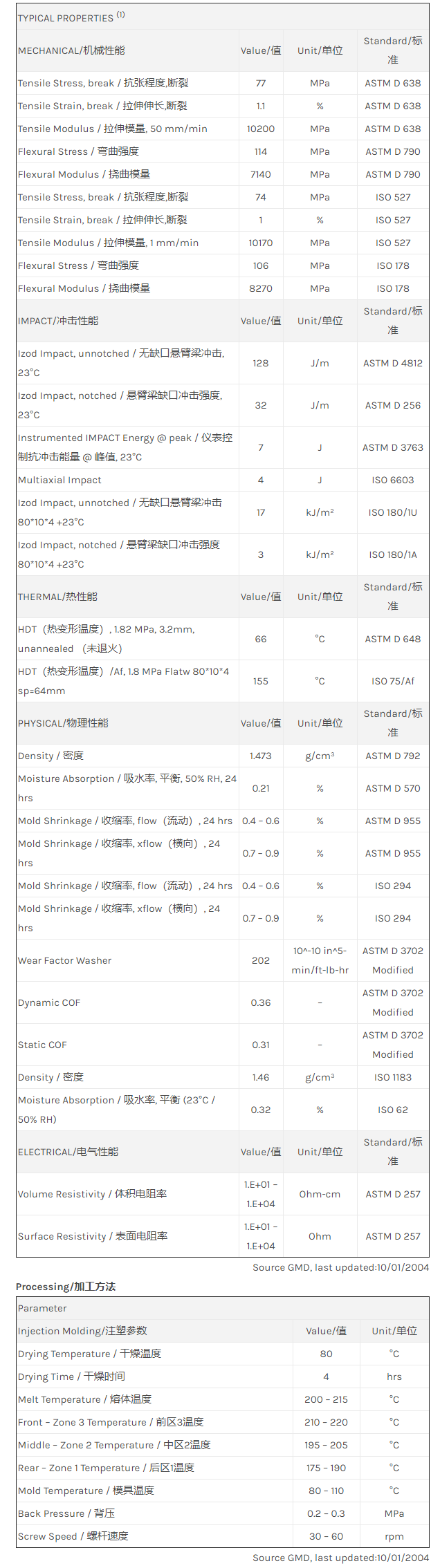 应用范围: 产品描述 LNP Statkon KEP33物性表 “LNP STAT-KON KEP33是一种聚甲醛(POM)共聚物材料,含有的填充物为碳纤维增强材料,加工方式为:注射成型。 LNP STAT-KON KEP33的主要特性有: 传导性 润滑” LNP STAT-KON* KEP33 is a compound based on Acetal resin containing Ca