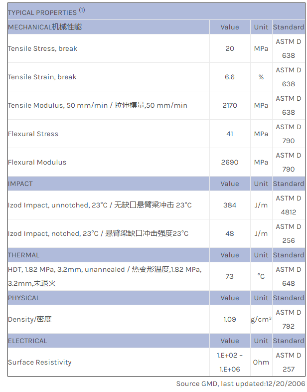 应用范围: 产品描述 LNP STATKON CD000I物性表 LNP STAT-KON CD000I是一种高抗冲聚苯乙烯产品,含有的填充物为炭粉,可以通过注射成型进行加工。 特性包括: 传导性 耐冲击