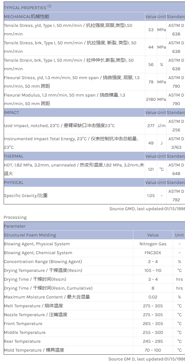 应用范围:产品描述NORYL PPO MX5560物性表PRELIMINARY DATA. Foamable PPE+PS with superior ductility. Property data based on solid specimens.