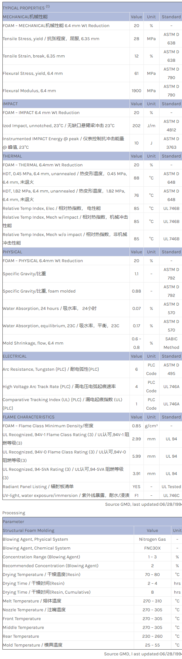 应用范围:产品描述NORYL PPO PX5704物性表Structural foam resin. 170F HDT. All values at 20% weight reduction.
