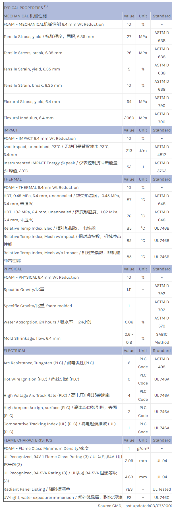 Foamable resin. All properties at 10% Density/密度reduction; 0.250″ thick test specimens. Rework based PPO+PS. Black only