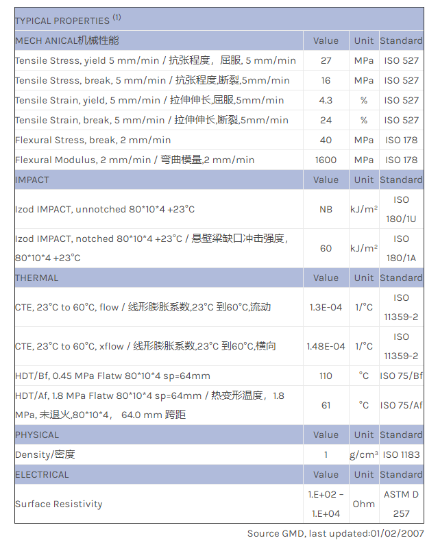 应用范围:产品描述LNP STATKON MD0001物性表LNP* Stat-kon* MD0001 is a compound based on Polypropylene resin. Added features of this material include: Electrically Conductive, High IMPACT.