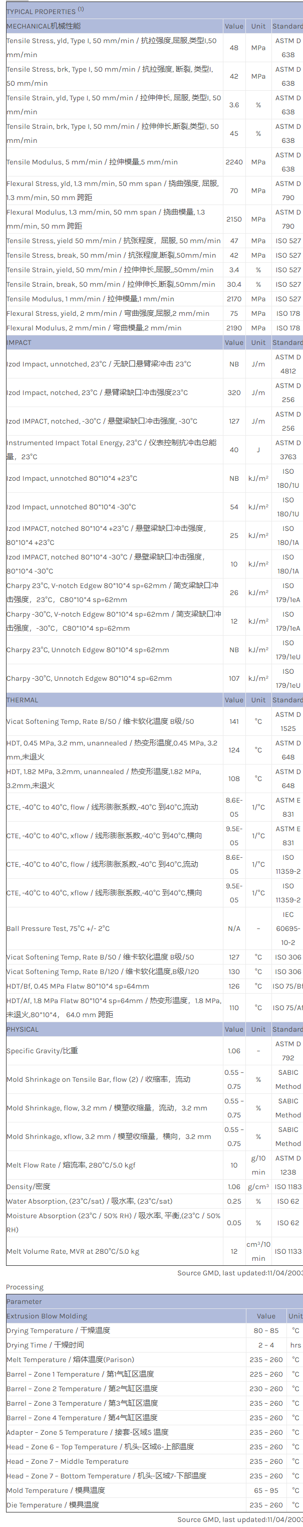 NORYL BN9003G resin是一种聚苯醚+PS(PPE+PS)产品,可以通过挤出吹塑成型进行加工。