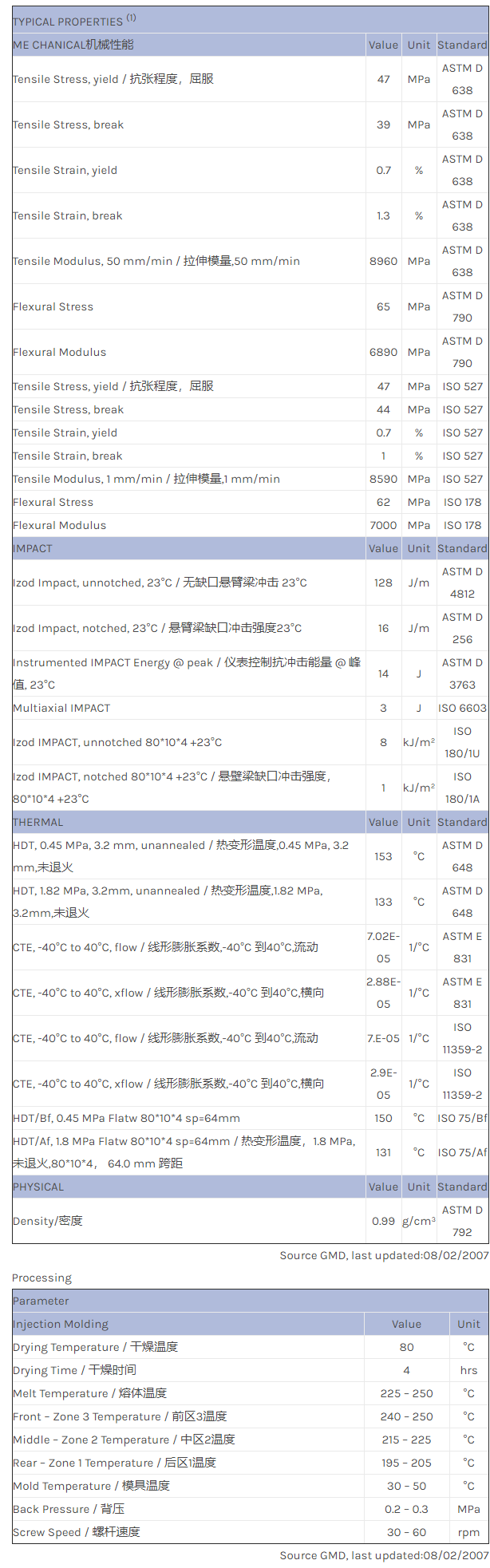 应用范围: 产品描述 LNP STATKON ME003S物性表 LNP STAT-KON ME003S是一种聚丙烯材料,含有的填充物为碳纤维增强材料,加工方式为:注射成型。 LNP STAT-KON ME003S的主要特性为:传导性。