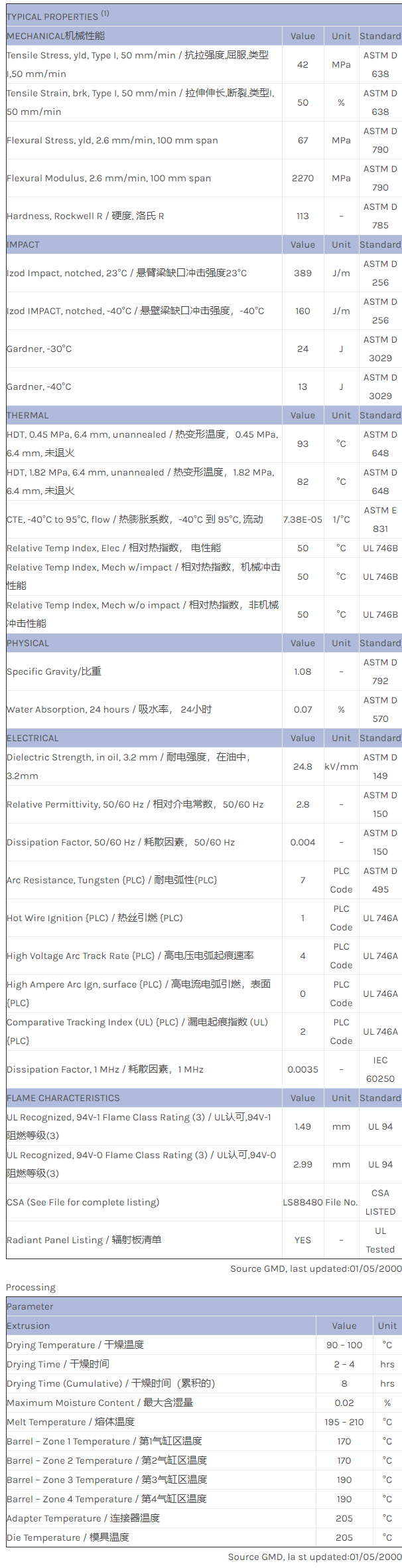 应用范围:产品描述NORYL PPO EN185物性表挤塑级。优异的冲击强度。DTUL(载荷下挠曲温度):185F (85C)。 UL94 V-1额定值。相关色号:EN185-GY81041