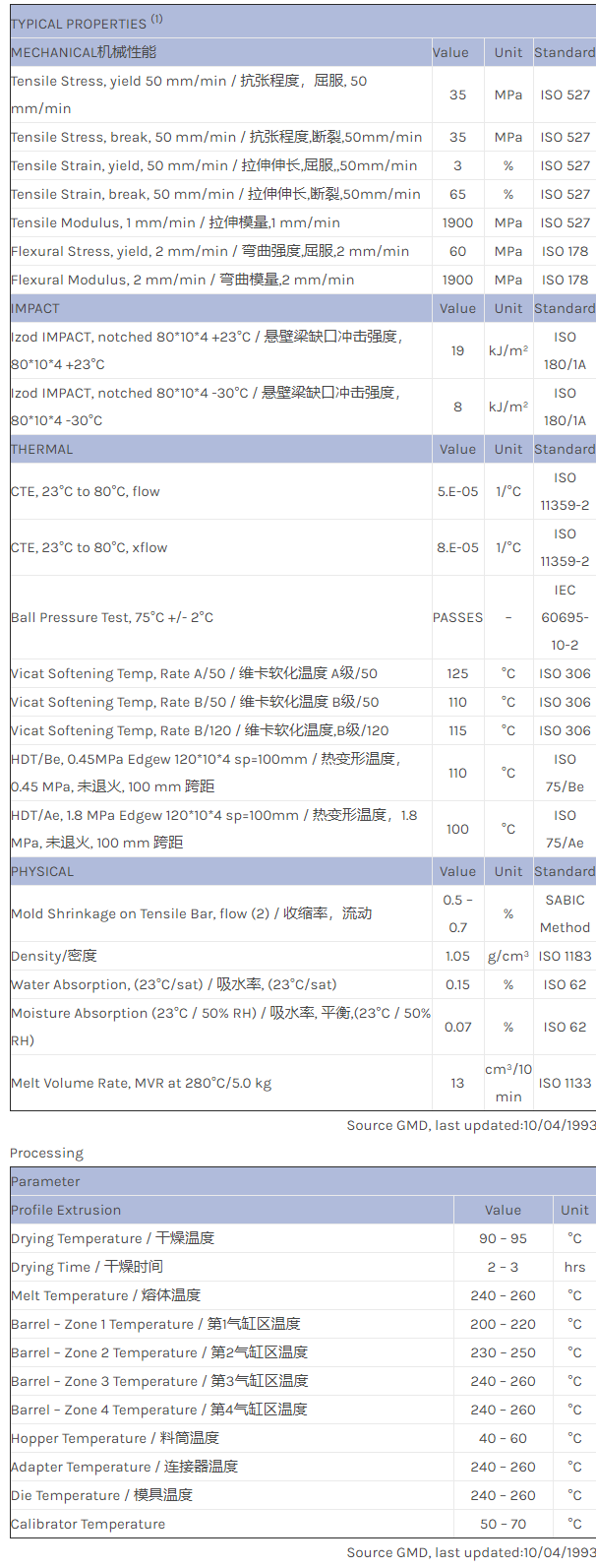 应用范围:产品描述NORYL PPO EN1896物性表NORYL EN1896 is an extrusion material with a Vicat B/120 of 115 ºC according ISO 306. NORYL EN1896 is used in the automotive industry for trims and in general where high impact