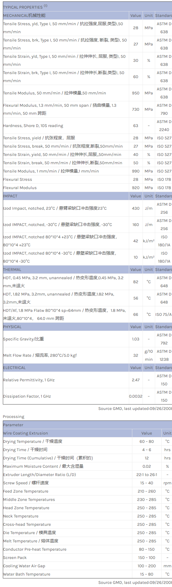应用范围:产品描述NORYL PPO EXNL1116物性表Flexible, non-halogenated FR, mPPE extrusion grade material for evaluation in automotive wire coating applications requiring ISO6722.