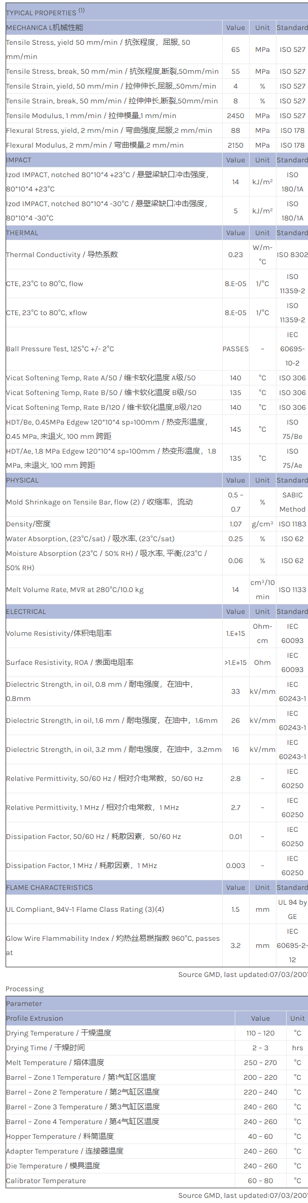 应用范围:产品描述NORYL PPO PO2271物性表NORYL PO2271 is a medium heat, flame retardant extrusion grade with improved release package to decrease screw sticking tendency.