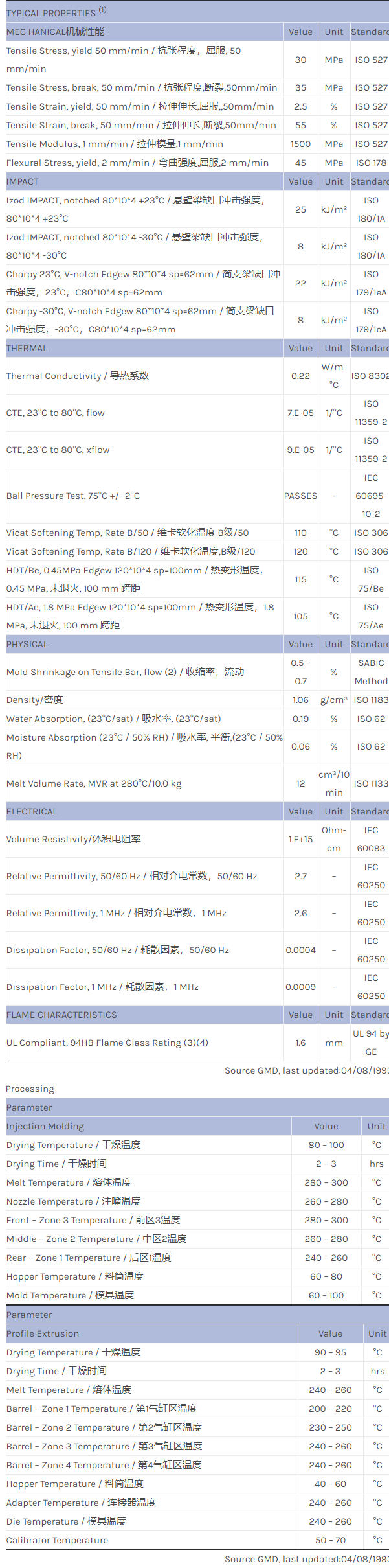 NORYL PX1185 resin是一种聚苯醚+PS(PPE+PS)材料,加工方式为:型材挤出成型或注射成型。