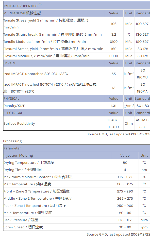 应用范围: 产品描述 LNP STATKON PX09011物性表 LNP STAT-KON PX09011是一种聚酰胺6(尼龙6)材料,含有的填充物为玻璃\炭粉,加工方式为:注射成型。 LNP STAT-KON PX09011的主要特性有: 通过ROHS认证 传导性 加工性能良好