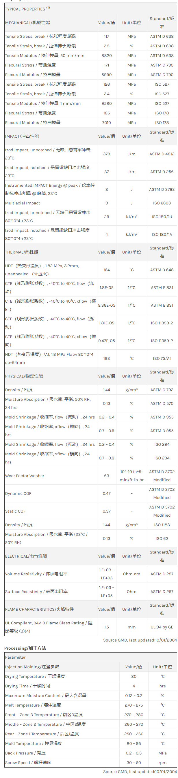 应用范围: 产品描述 LNP Statkon QEL329物性表 “LNP STAT-KON QEL329是一种聚酰胺610(尼龙6/10)产品,含有的填充物为10%碳纤维增强材料,可以通过注射成型进行加工。 特性包括: 阻燃/额定火焰 Flame Retardant 传导性 耐磨 润滑” LNP STAT-KON* QEL329 is a compound based on Nylon