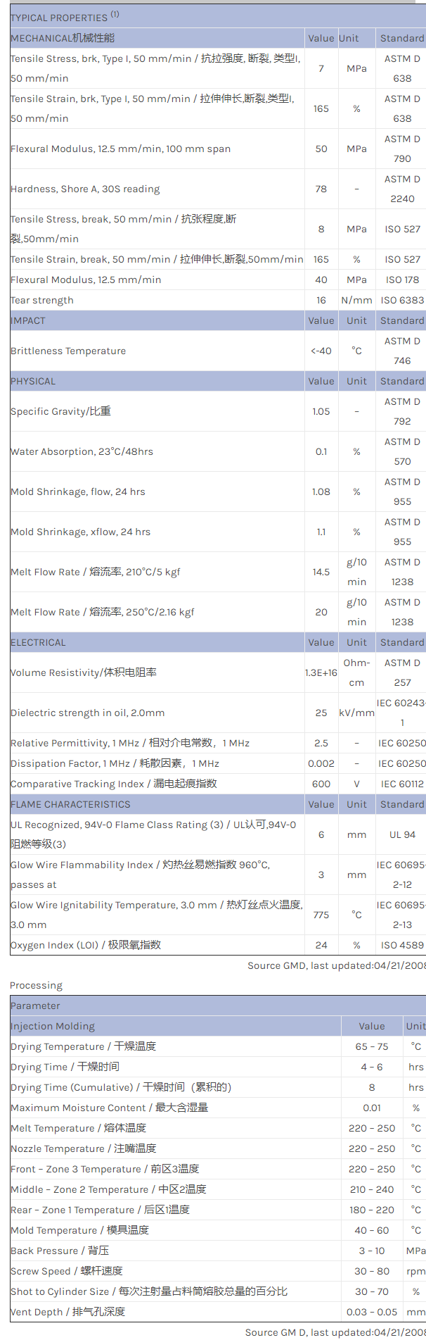 应用范围:产品描述NORYL PPO WCP761物性表NORYL WCP761 resin是一种聚苯醚+TPE(PPE+TPE)产品,可以通过注射成型进行加工。应用领域包括工程/工业配件、电气/电子应用和电线电缆。特性包括:阻燃/额定火焰Flame Retardant加工性能良好良好的柔韧性无卤素相关色号:WCP761-BK1066、WCP761-YW5G022、WCP761-WH8G630、WCP761