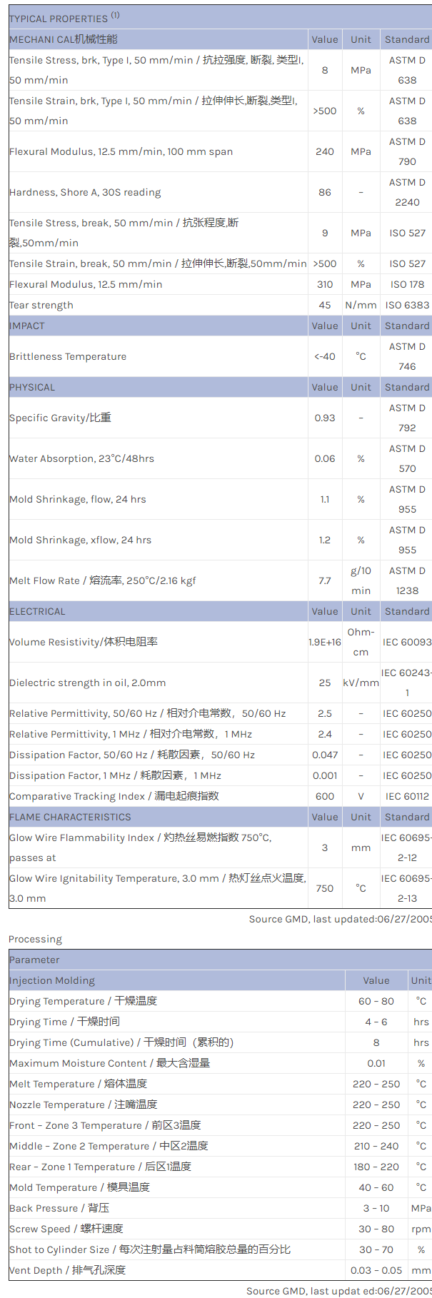 应用范围:产品描述NORYL PPO WCP860物性表Flexible, injection grade PPE-TPE suitable for over-molding applications such as plugs and strain relief’s. Good processability. 86 Shore A hardness.