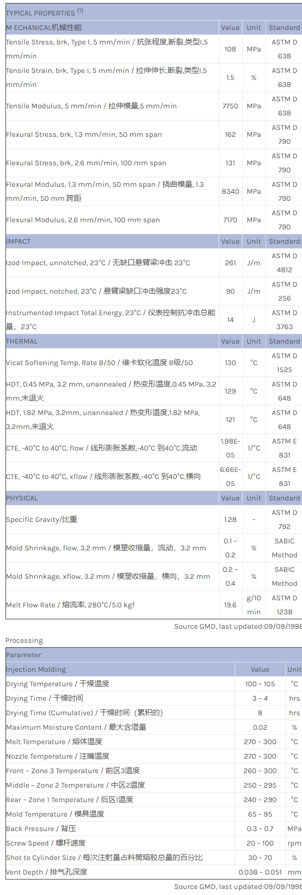 应用范围:产品描述NORYL PPO EM7430物性表30% glass reinforced, high flow PPO. Automotive. Energy management material.
