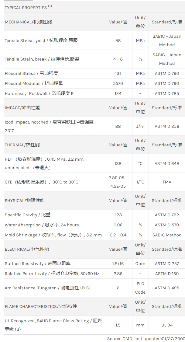 应用范围:产品描述Noryl PPO GFN2L物性表“NORYL GFN2L resin是一种聚苯醚+PS(PPE+PS)材料,含有的填充物为20%玻璃纤维增强材料。主要特性有:阻燃/额定火焰水解稳定性”Property/特性