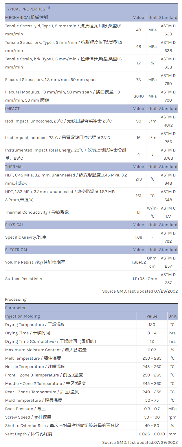 SINGLE LOT DATA. 45% graphite filled PBT. Flame resistant, electrically and thermally conductive. Automotive heat sinks/spreaders, cooling fans.