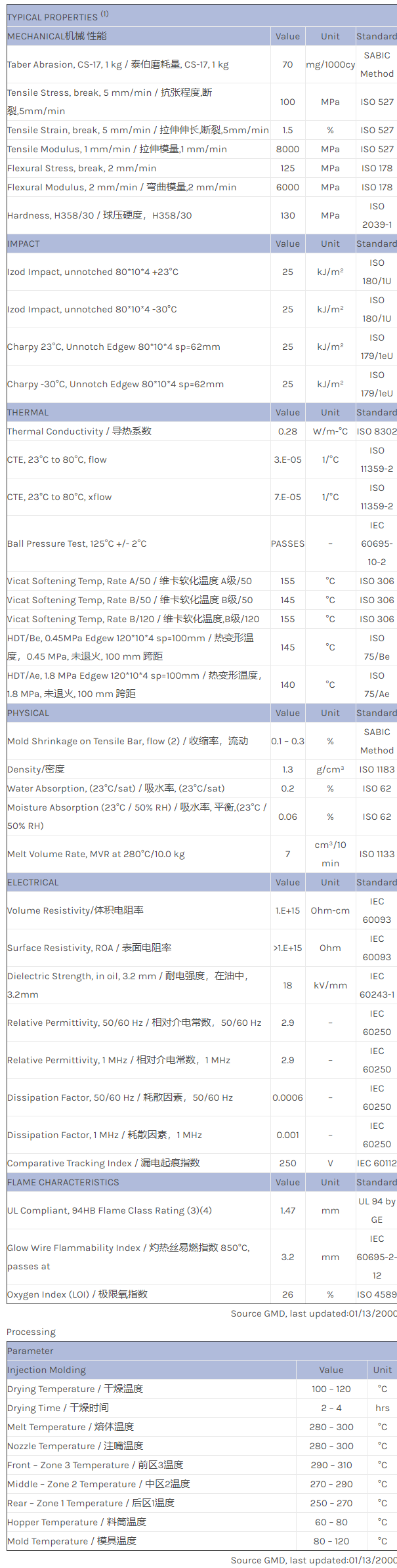 应用范围:产品描述NORYL PPO GFN3E物性表NORYL GFN3E is a 30% glass fiber reinforced material and available in limited colours.