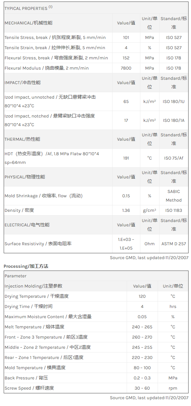 应用范围: 产品描述 LNP Statkon WEF32ISP物性表 “LNP STAT-KON WEF32ISP是一种聚丁烯对苯二甲酸酯(PBT)材料,含有的填充物为玻璃、碳纤维增强材料,加工方式为:注射成型。 LNP STAT-KON WEF32ISP的主要特性有: 通过ROHS认证” LNP * Stat-kon* WEF32ISP is a compound based on Polyb