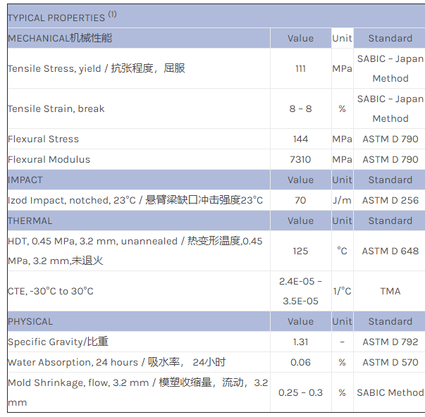 30%玻纤/矿物填充 、高模量牌号。 DTUL(载荷下挠曲温度):248F (120C)。 UL94 V-1/5VA 额定值。有黑色和灰色。