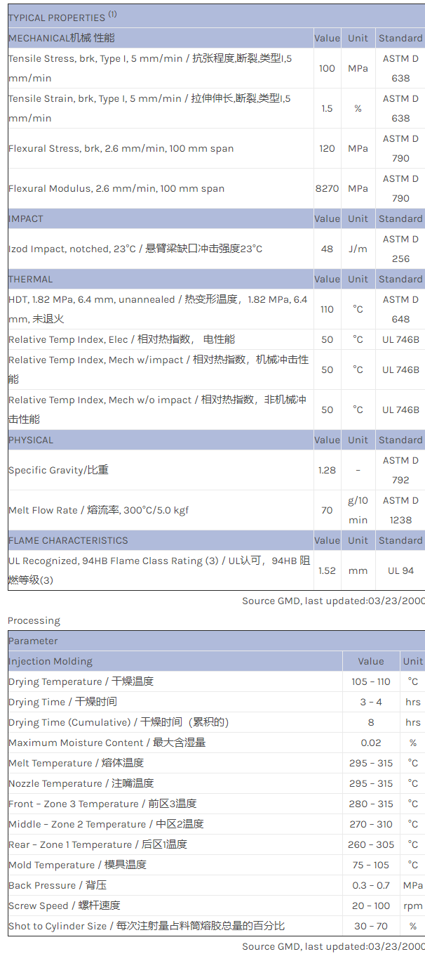 应用范围:产品描述NORYL PPO MX5896物性表PRELIMINARY DATA. 20% glass/10 mineral reinforced PPE+PS. High modulus, tight tolerances. High flow.