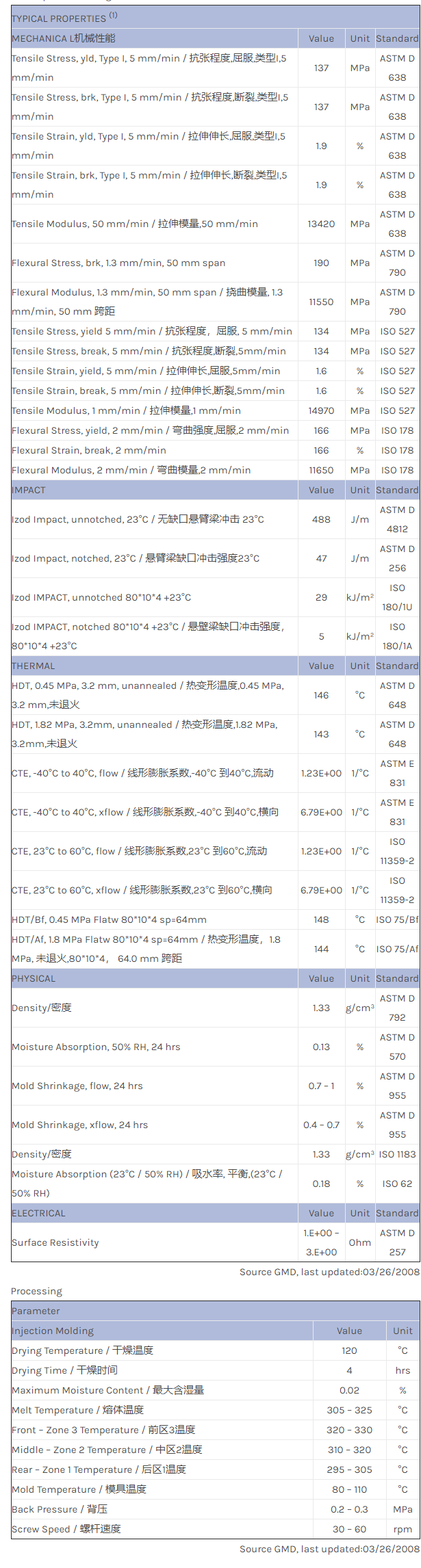 应用范围: 产品描述 LNP STATKON DE0049F物性表 LNP Stat-Kon DC-1004 FR MS is a carbon fiber filled polycarbonate with flame retardant and superior molding characteristics.