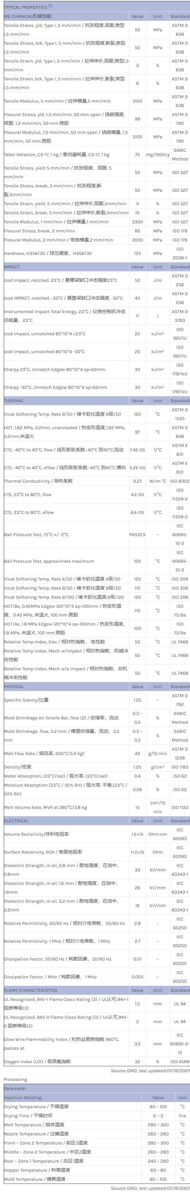 应用范围:产品描述NORYL PPO V01505物性表Noryl* V01505 is a 15% milled fibre reinforced, injection moldable grade. Designed for good dimensional stability and low warpage, this resin also uses non-chlorinated, non-brom