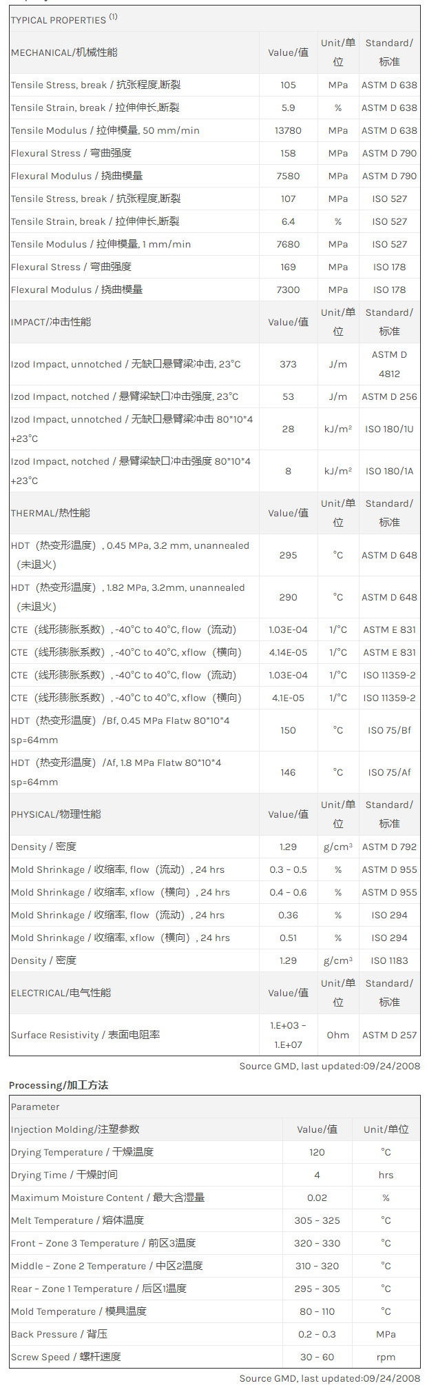 应用范围: 产品描述 LNP Statkon DX05474物性表 “LNP STAT-KON DX05474是一种聚碳酸酯(PC)产品,含有的填充物为10%碳纤维增强材料,可以通过注射成型进行加工。 特性包括: Flame Retardant 传导性 加工性能良好 脱模剂 优良的脱模剂” LNP* Stat-kon* DX05474 is a compound based on Pol