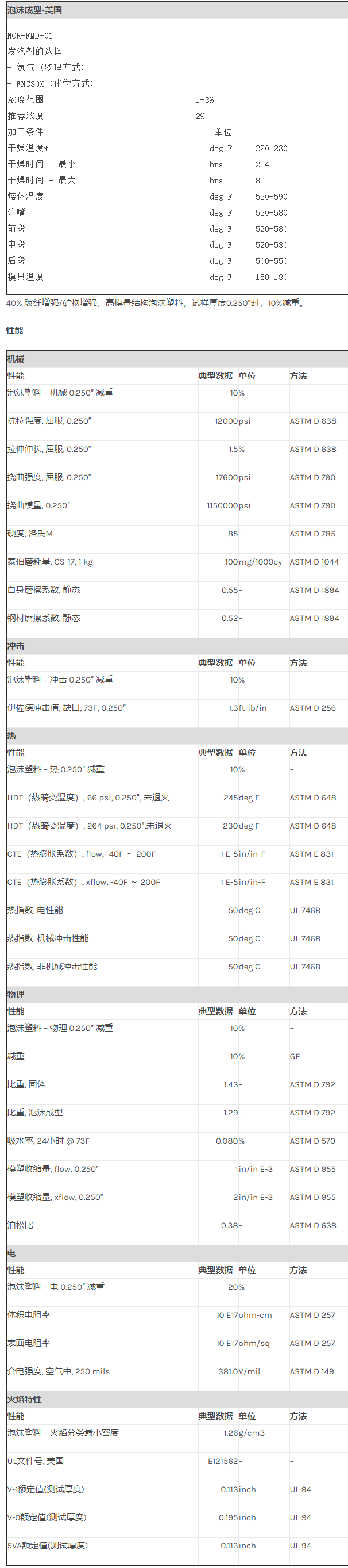 应用范围:产品描述Noryl PPO FM4025物性表40% 玻纤增强/矿物增强,高模量结构泡沫塑料。试样厚度0.250″时,10%减重。加工