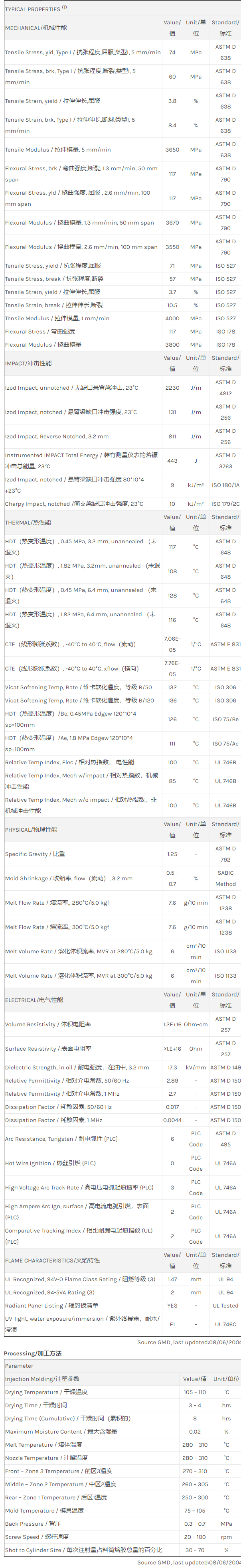 PPE+PS blend. 17% Mineral reinforced. Non-brominated, non-chlorinated FR system. UL94 V0 and 5VA listing. UL746C f1. Radiant Panel Listing / 辐射板清单. Dielectric strength. Dimensional stability. Suitable for E/E market indoor/outdoor applications including electrical ceiling boxes and smoke detectors.