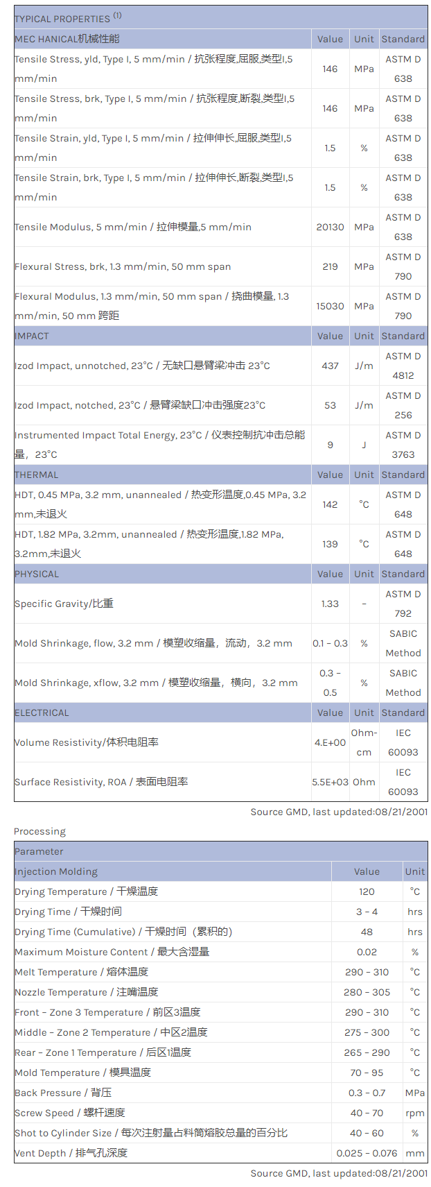 SINGLE LOT DATA. 30% carbon fiber reinforced. Conductive and non-ECO flame retardant. Business and computer equipment. UL V-0 rating pending.
