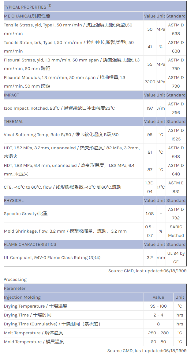 应用范围:产品描述NORYL PPO N190A物性表低热、阻燃PPO/HIPS合金化聚合物。 仅有内燃产物。非UL认可材料。
