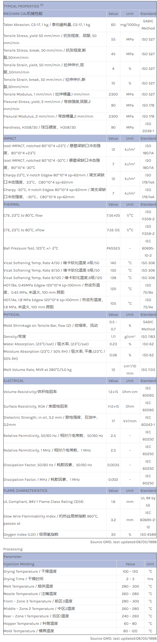 应用范围:产品描述NORYL PPO PO2275物性表NORYL PO2275 is an unfilled, high flow, halogen free (according to VDE/DIN 472 part815) flame retardant material with medium heat resistance.