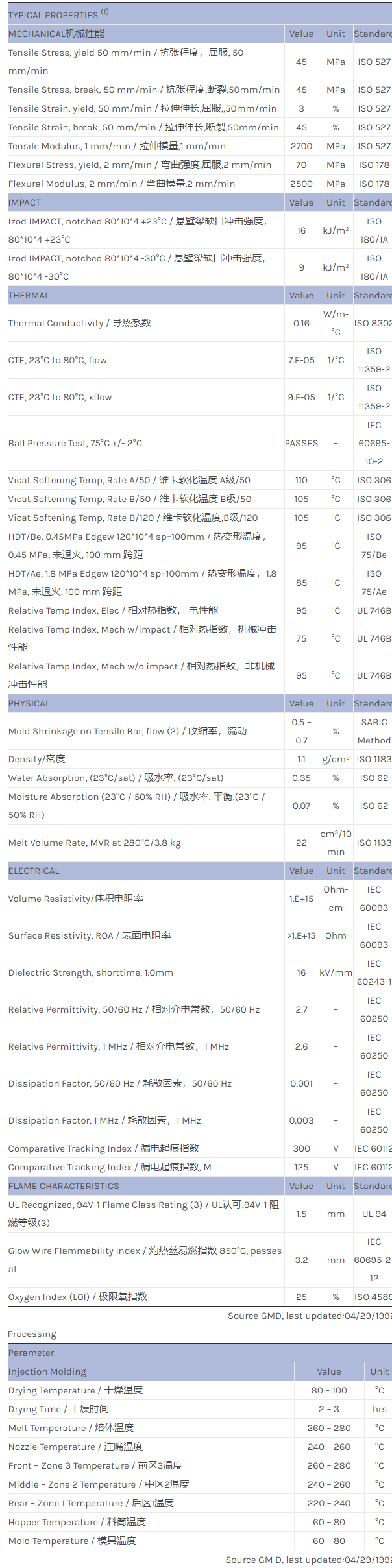 应用范围:产品描述NORYL PPO PX2144物性表Noryl PX2144 is a standard, unfilled flame retardant injection moulding grade. PX2144 has a Vicat B/120 of 110 ºC and a flammability rating of 94V-1 at 1.6 mm