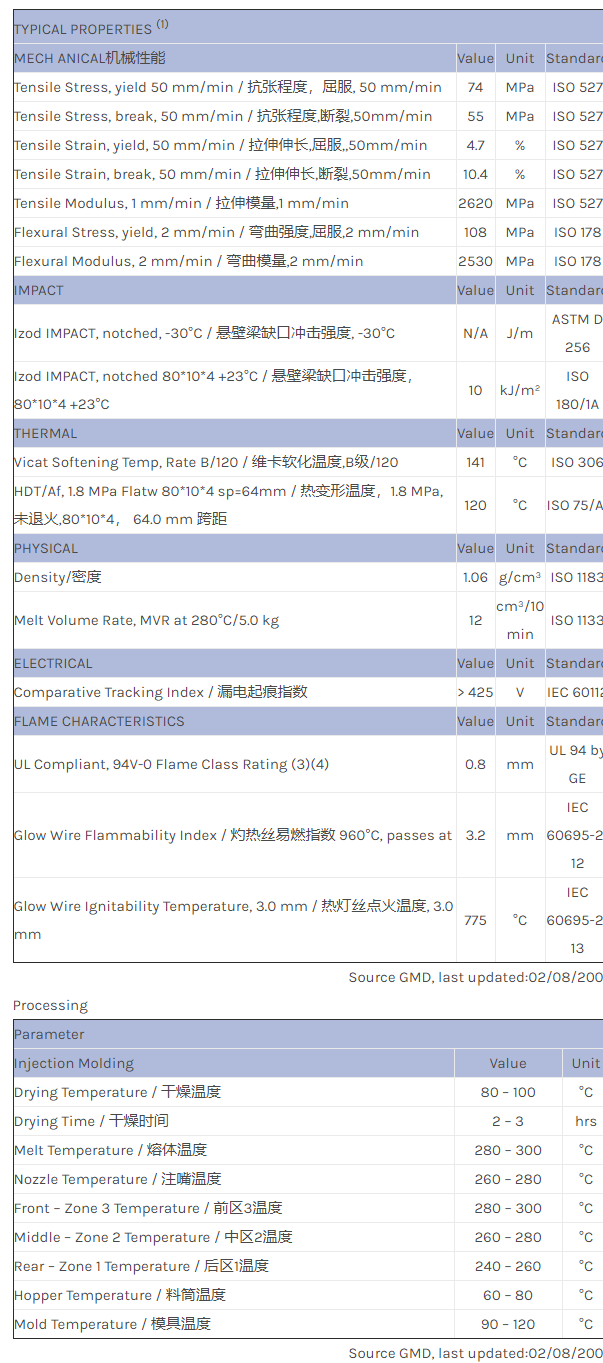 应用范围:产品描述NORYL PPO EXNL0010物性表Noryl* EXNL0010 is an unfilled, injection moldable modified Polyphenylene Oxide (PPO) + Polystyrene (PS) resin. Designed for heat resistance and thin wall FR performance, this