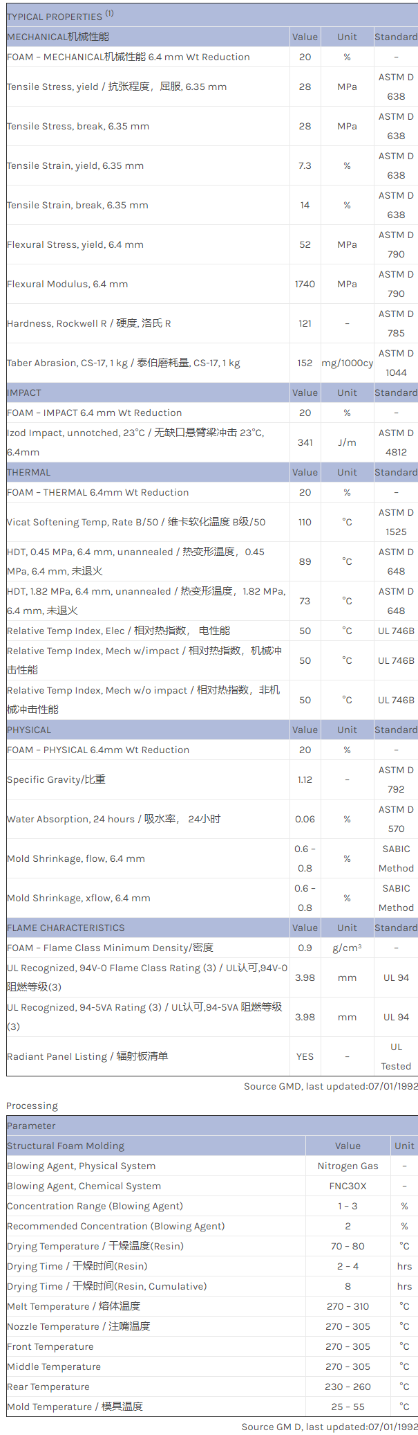应用范围:产品描述NORYL PPO FN150X物性表改良的可靠性与生产率。薄壁性能。 UL94 V-0/5VA额定。试样厚度0.250″,20%减重的数据。相关色号:FN150X-GY6C356、FN150-GY4722