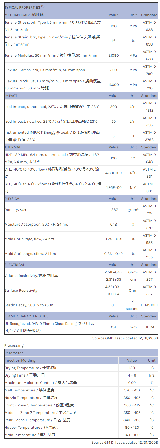 应用范围:产品描述LNP STATKON EX08308C物性表Stat-Kon* EX08308C is a high cleanliness Polyetherimide Compound reinforced with Carbon Fiber for use in applications requiring the highest level of cleanliness. This compou