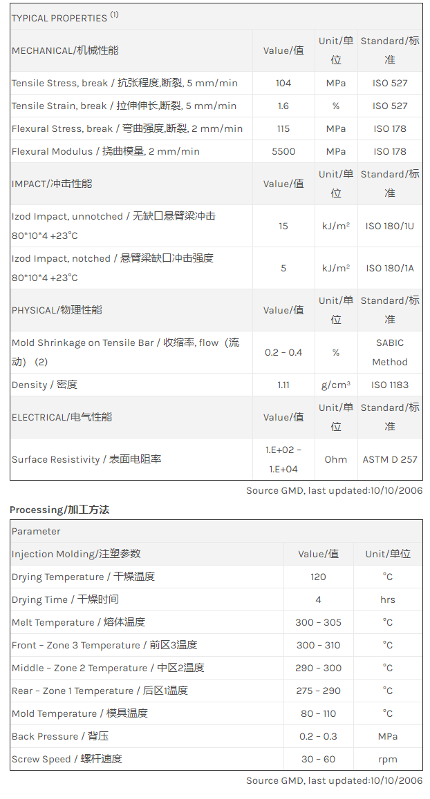 应用范围: 产品描述 LNP Statkon ZE002物性表 “LNP STAT-KON ZE002是一种聚苯醚+PS(PPE+PS)材料,含有的填充物为碳纤维增强材料,加工方式为:注射成型。 LNP STAT-KON ZE002的主要特性有: 通过ROHS认证 传导性” LNP* Stat-kon* ZE002 is a compound based on PPE+PS Blend res