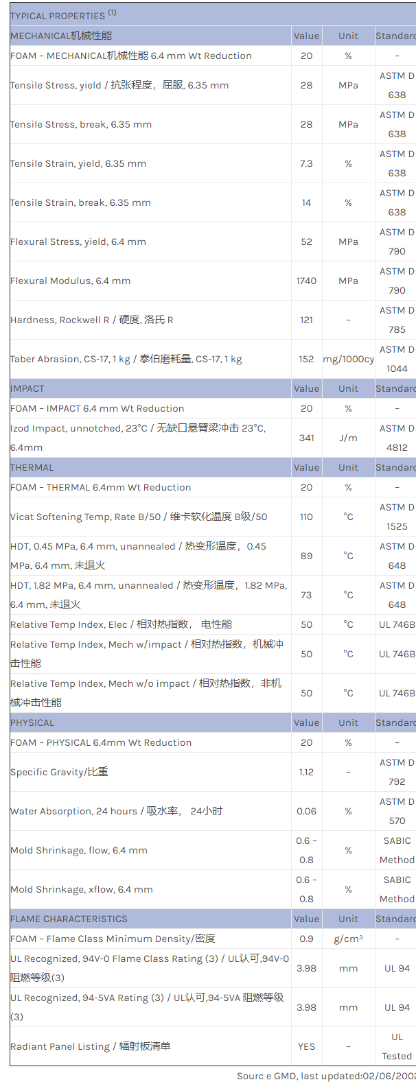 应用范围:产品描述NORYL PPO PX1500X物性表Improved reliability and productivity. Thin wall capability. UL94 V-0/5VA rated. All data at 20% weight reduction and 0.250″ wall.