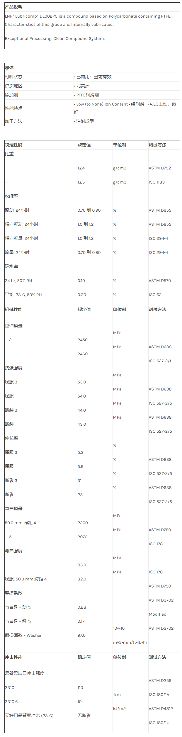 应用范围:产品描述LNP LUBRICOMP DL002PC物性表