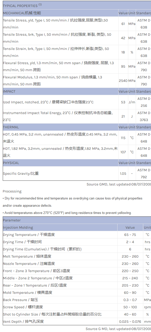 应用范围:产品描述NORYL PPO MX6111物性表Transparent, non-FR PPE+PS. Higher impact, 230F HDT at 66 psi. FDA compliant in some colors.