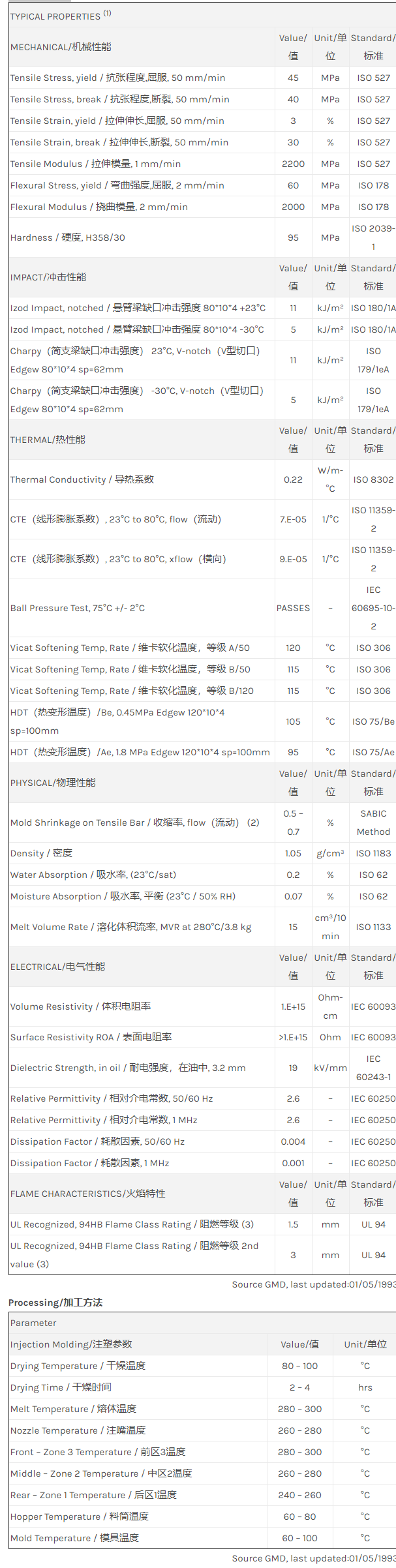 “NORYL N110S resin是一种聚苯醚+PS(PPE+PS)材料,加工方式为:注射成型。