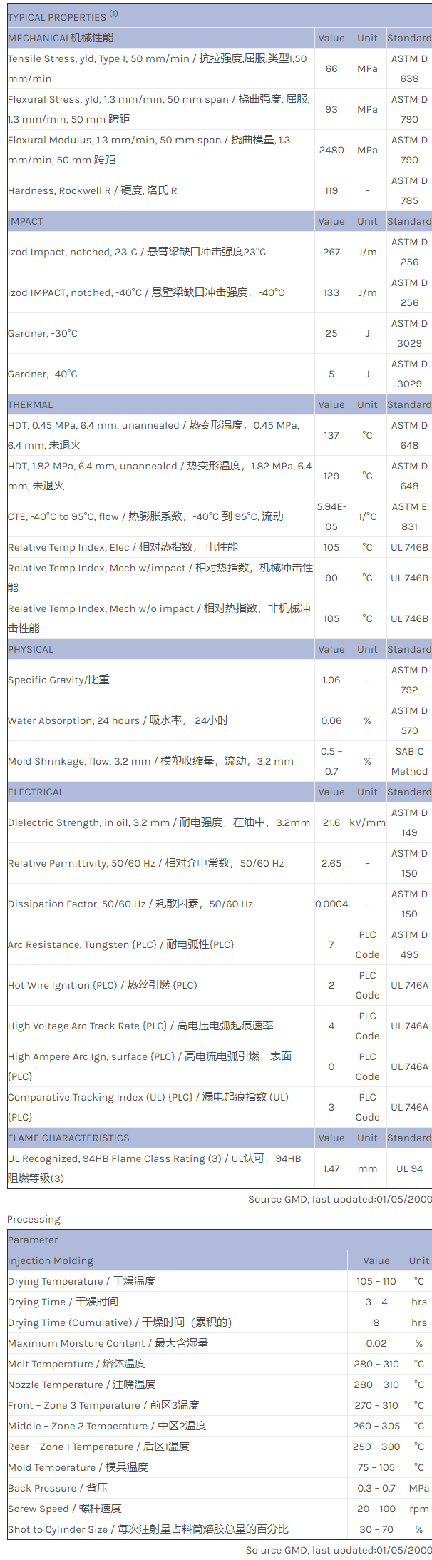 应用范围:产品描述NORYL PPO 731H物性表高光泽、通用牌号。DTUL(载荷下挠曲温度):130C (266F)。 UL 94 额定HB 值。多用插座、酒精滤板等。