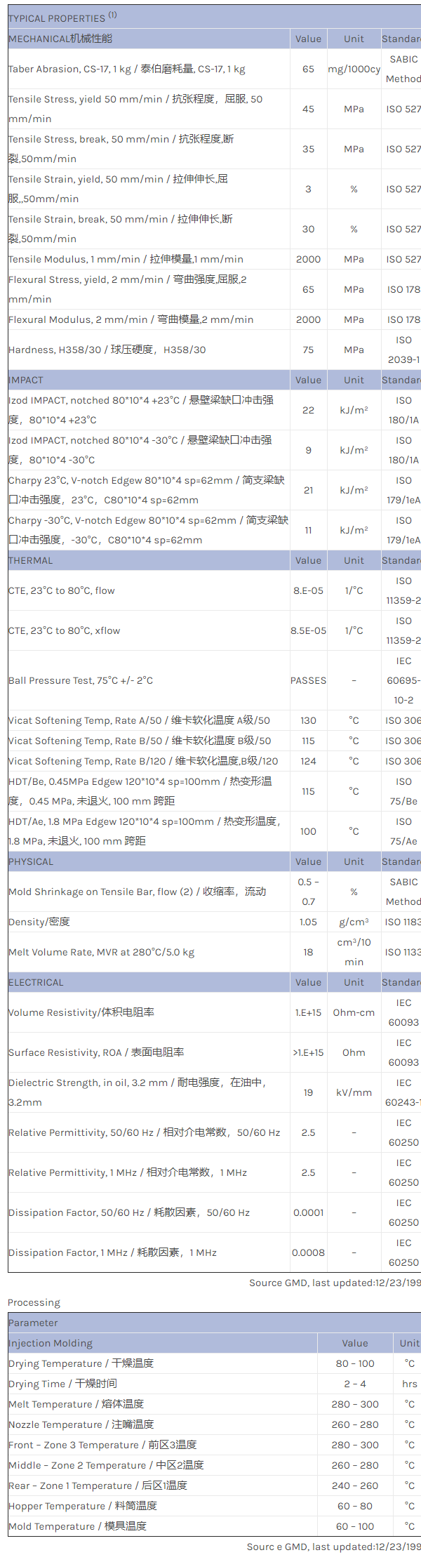 应用范围:产品描述NORYL PPO PO2318A物性表Noryl PO2318A is an unfilled material with improved heat ageing performance.