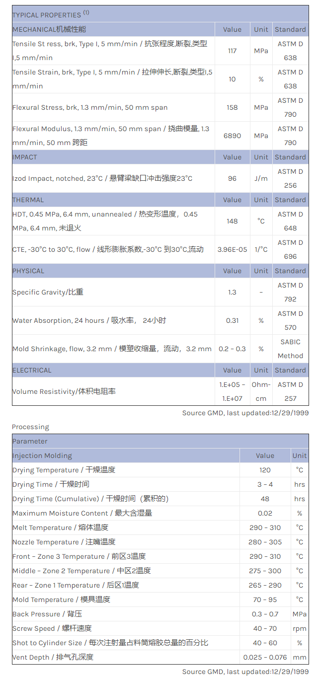 Made and tested at GEP Japan. PC+PTFE, 10% carbon fiber filled. Excellent MECHANICAL机械性能 strength/dimensional stability and abrasion resistance.