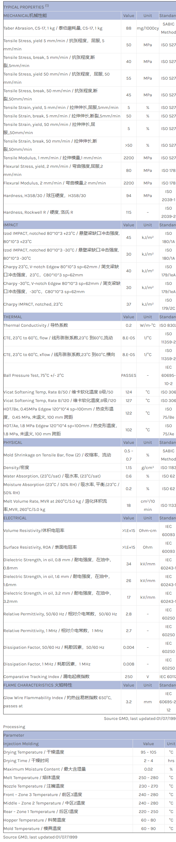 应用范围:产品描述CYCOLOY PC/ABS MC2231物性表CYCOLOY MC2231 is a PC+ABS blend in which excellent processability is combined with superior ductility at subzero temperatures and heat resistance.
