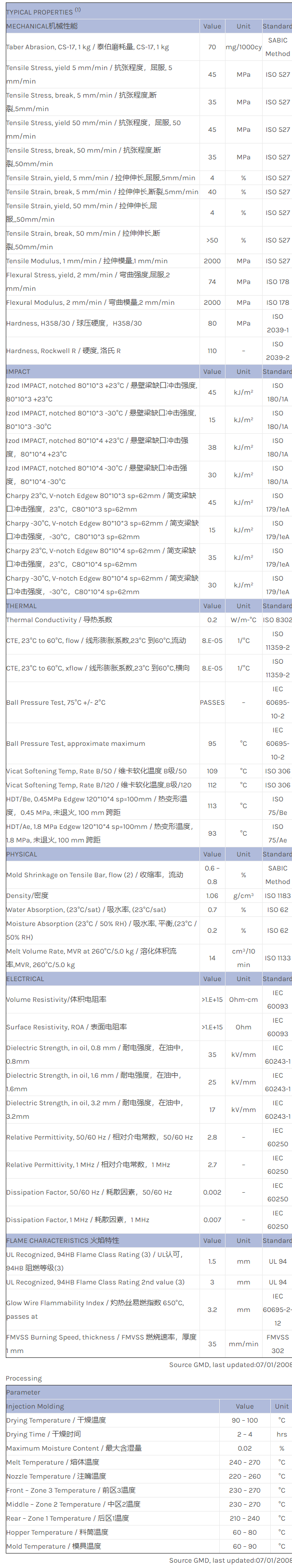 应用范围:产品描述CYCOLOY PC/ABS C1000A物性表CYCOLOY C1000A is a PC+ABS blend with improved low temperature ductility IMPACT over C1000 and offers an excellent processability. CYCOLOY C1000A is also suitable for plati