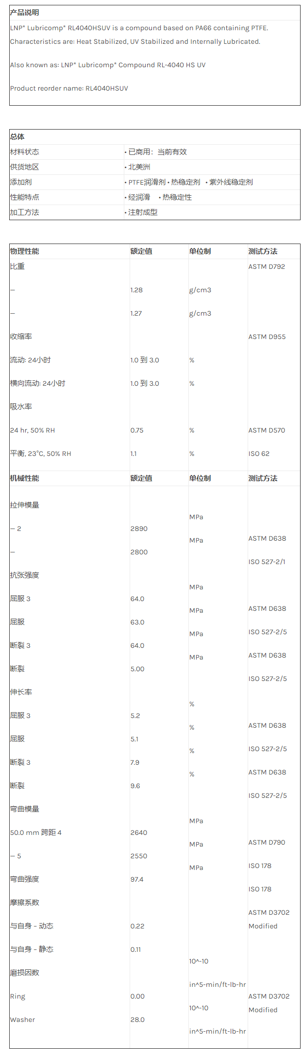 应用范围:产品描述LNP LUBRICOMP RL4040HSUV物性表