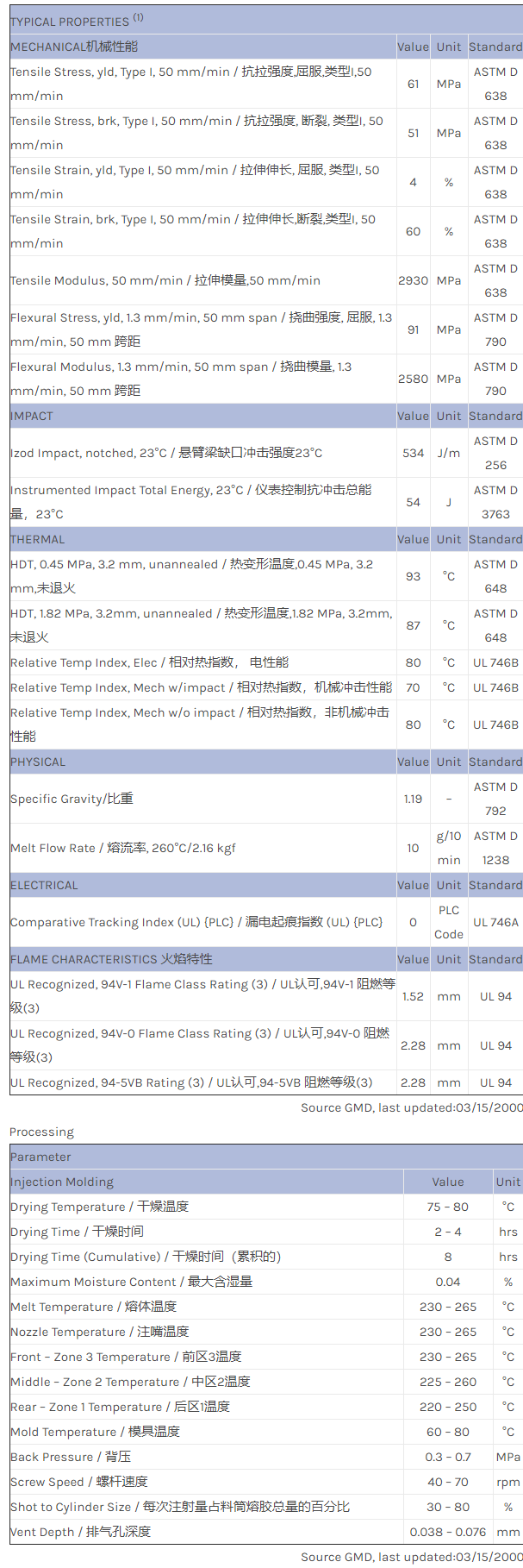 PRELIMINARY DATA. 50% pre-consumer based PC+ABS recycle. Flame retardant.