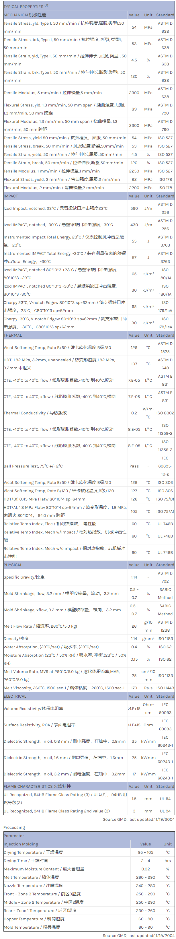 应用范围:产品描述CYCOLOY PC/ABS CY9650物性表PC+ABS, High IMPACT and High Flow, ductility at low temperature, excellent properties retention after Hydrolytic and Heat Aging